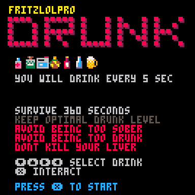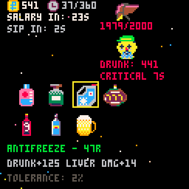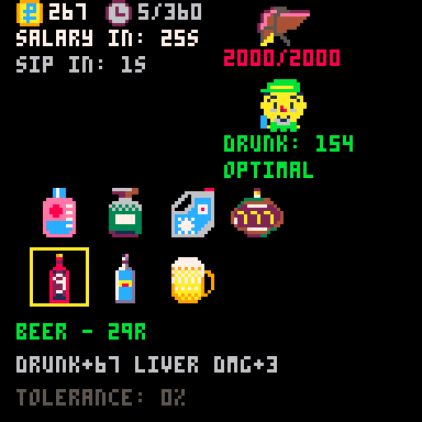 Alcohol is automatically consumed at regular intervals. Your main task is to choose what to drink, manage your budget, and deal with the side effects.